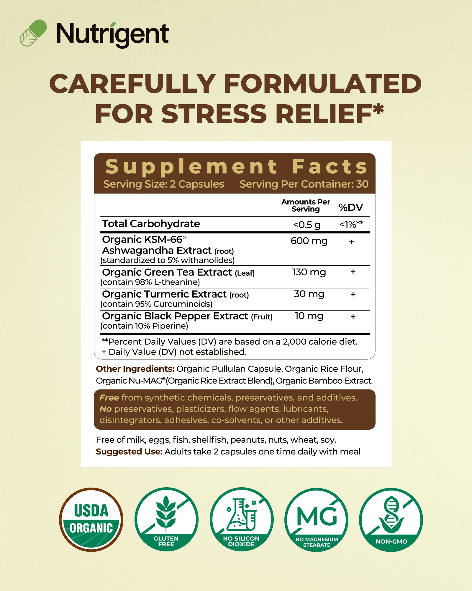 ● USDA Organic: Certified organic formula featuring Organic KSM-66® Ashwagandha, Organic L-Theanine, Organic Turmeric, and Organic Black Pepper—crafted with clean, plant-based ingredients and no synthetic additives.